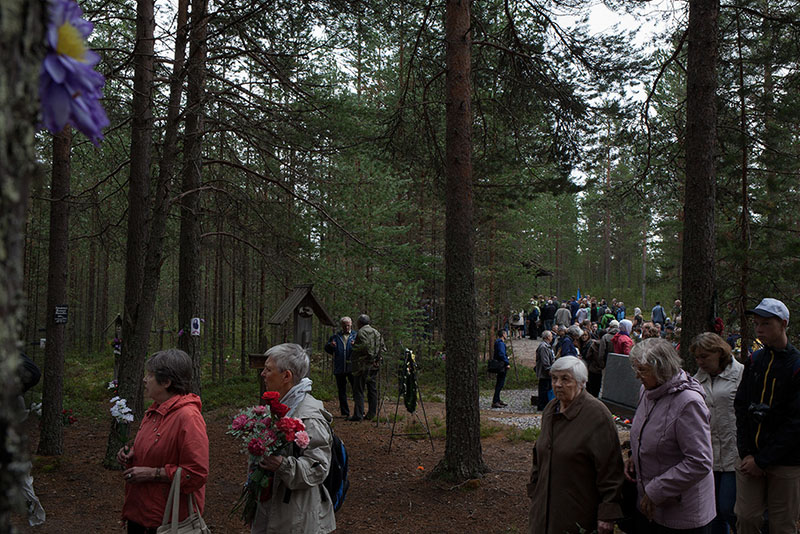 Здесь в 1930-е было расстреляно свыше 9 тысяч человек. На День памяти приезжают сотни людей. У них разные политические взгляды, языки и верования. На трибуне друг друга сменяют либералы и казаки, председатель петрозаводской еврейской общины и местный муфтий. Не у всех здесь даже расстреляны родственники. Их объединяет бережное отношение к памяти.
